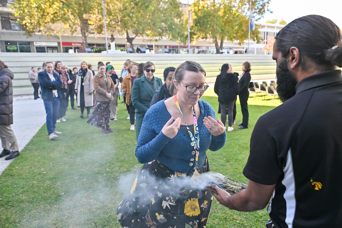 Held in the Plaza, the event opened with a Smoking Ceremony led by Cliffy ‘Tangku Munaitya’ Wilson, a proud Kaurna, Narungga, Ngarrindjeri, Ngadjuri, and Arrente man. The gathering brought together students, staff, and community members in a shared moment of cultural respect and reflection.